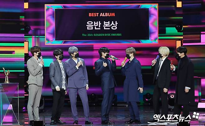 [엑스포츠뉴스 윤다희 기자] 10일 오후 경기도 고양시 킨텍스에서 비대면 사전녹화로 진행된 ‘제35회 골든디스크어워즈 with 큐라프록스’ 음반 부문 시상식에 참석한 그룹 방탄소년단(BTS)이 음반 본상을 수상하고 있다.