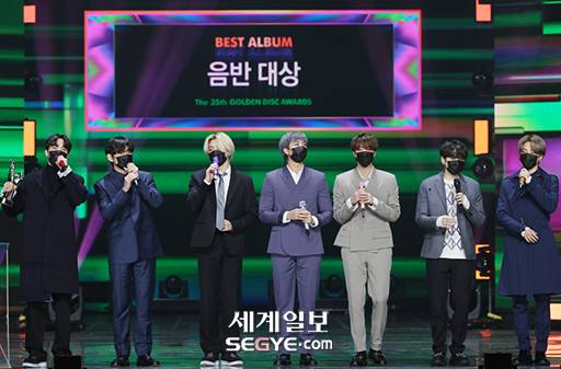 그룹 방탄소년단이 10일 오후 경기도 고양시 대화동 킨텍스에서 언택트로 열린 ’제35회 2021 골든디스크 어워즈 with 큐라프록스’ 디지털 음반 부문에서 대상을 수상 후 소감을 말하고 있다.