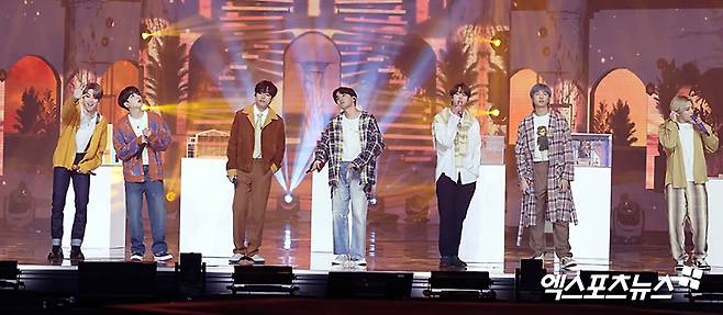 [엑스포츠뉴스 윤다희 기자] 10일 오후 경기도 고양시 킨텍스에서 비대면 사전녹화로 진행된 ‘제35회 골든디스크어워즈 with 큐라프록스’ 음반 부문 시상식에 참석한 그룹 방탄소년단(BTS)이 멋진 무대를 선보이고 있다.