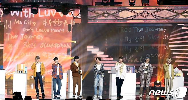 (서울=뉴스1) 권현진 기자 = 방탄소년단(BTS) 지민(왼쪽부터), 슈가, 뷔, 제이홉, 진, RM, 정국이 10일 오후 경기도 고양시 일산 킨텍스에서 온택트로 진행된 '제35회 골든디스크 어워즈 with 큐라프록스' 디지털 음반 부문 부문 시상식에 참석해 화려한 축하 공연을 선보이고 있다. (골든디스크어워즈 사무국 제공) 2021.1.10/뉴스1