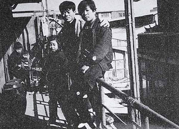 | ▲ 1968년경 중부시장에서 시다로 일할 때의 전태일(가운데). 20살이 된 전태일은 근로기준법 해설책을 찾아 읽기 시작한다. |