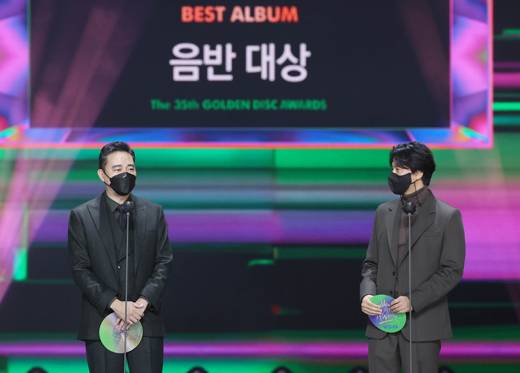[마이데일리 = 유진형 기자] 김남길이 10일 오후 경기도 고양시 킨텍스에서 온라인으로 진행된 '제35회 2021 골든디스크 어워즈 with 큐라프록스’ 음반 부문 시상식에서 홍정도 대표와 함께 대상을 발표하고 있다.