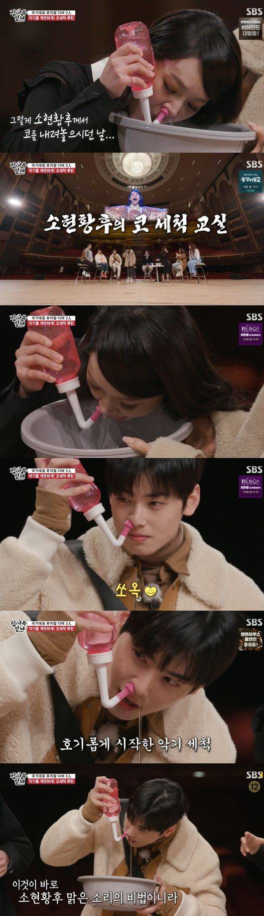 김소현에 이어 차지연까지 소개한 가운데, 김소현은 뮤지컬을 시작하기 앞서 악기를 청소한다며 코세척 루틴를 전했다. 갑작스러운 코세척 모습에 이승기는 "공원가면 식수대 느낌"이라 말해 폭소하게 했다. 분위기를 몰아, 차은우도 코세척을 성공했고, 양세형은 "물이 너무 깨끗해서 마시고 싶을 정도"라고 말해 모두를 폭소하게 했다.