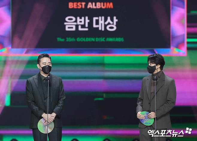 [엑스포츠뉴스 윤다희 기자] 10일 오후 경기도 고양시 킨텍스에서 비대면 사전녹화로 진행된 ‘제35회 골든디스크어워즈 with 큐라프록스’ 음반 부문 시상식에 참석한 홍정도 중앙일보 JTBC 대표이사 사장, 배우 김남길이 음반 대상을 발표하고 있다.