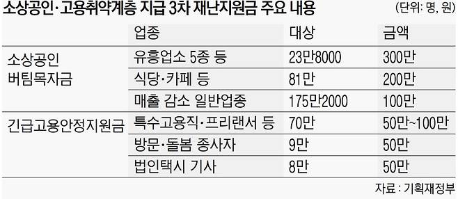 10일 정부의 3차 재난지원금(9조3000억원) 지급 계획을 보면 11일부터 소상공인 280만명에게 100만~300만원의 버팀목자금(4조1000억원)이 지급된다. 소득이 줄어든 특수고용직·프리랜서 70만명에게는 50만~100만원의 3차 긴급고용안정지원금이 지급된다. 정부는 설 명절 전까지 3차 재난지원금의 90%를 지급할 계획이다.