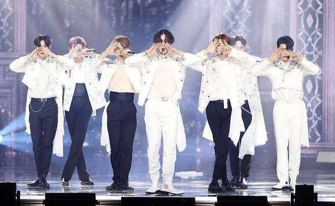 (서울=연합뉴스) 10일 경기도 고양 일산 킨텍스에서 열린 제35회 골든디스크 어워즈 with 큐라프록스에서 갓세븐이 무대를 선보이고 있다. 2021.1.10 [골든디스크어워즈 사무국 제공. 재판매 및 DB 금지]