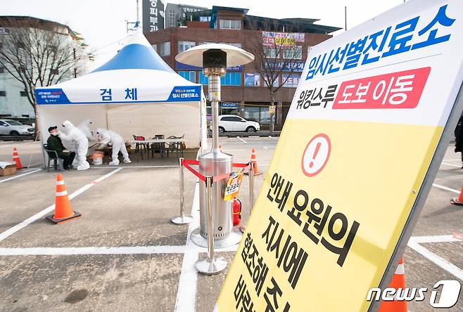 (구미=뉴스1) 정우용 기자 = 한파가 몰아친 10일 경북 구미시 원평동 금오천 1공영 주차장에 마련된 코로나19 선별진료소에서 시민들이 항체 채취를 하고 있다. 구미시는 오는 11일부터 일주일간 사회적 거리두기를 2.5단계로 상향하고 이곳과 인동보건지소 등 2곳에 임시 선별진료소를 추가로 설치해 원하는 모든 시민이 무료로 검사를 받을 수 있도록 했다. (구미시 제공) 2021.1.10/뉴스1