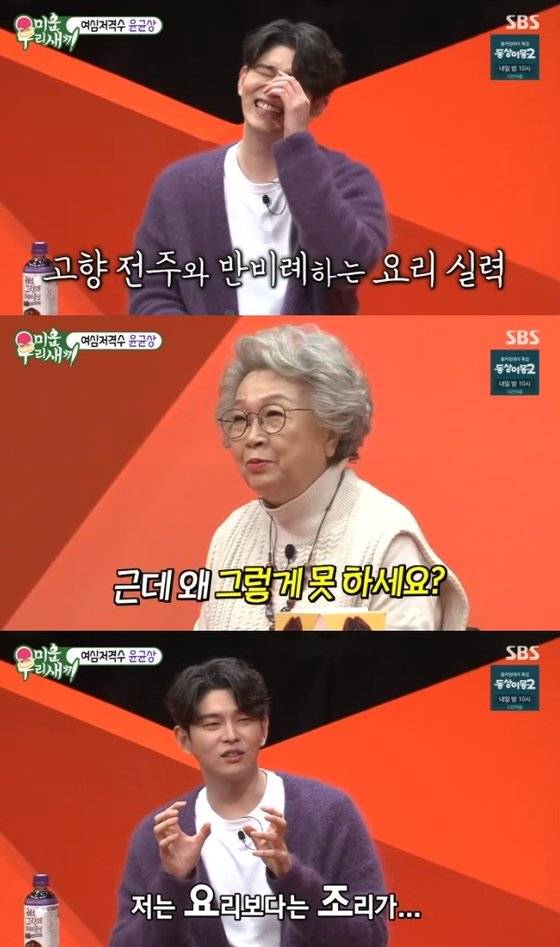 "전주 출신인데 왜 그렇게 요리를 못하냐"고 돌직구로 묻자 윤균상은 "내가 할 일이 없으니까 더 그런 것 같다. 어머니, 외할머니가 챙겨주는 것을 먹었다"며 "사실 요리에 관심 생겨서 해보려고 했는데 나는 요리보다는 조리가 맞더라. 뭔가 갈비찜을 한다던가 그런 요리를 못하겠다"고 토로했다.