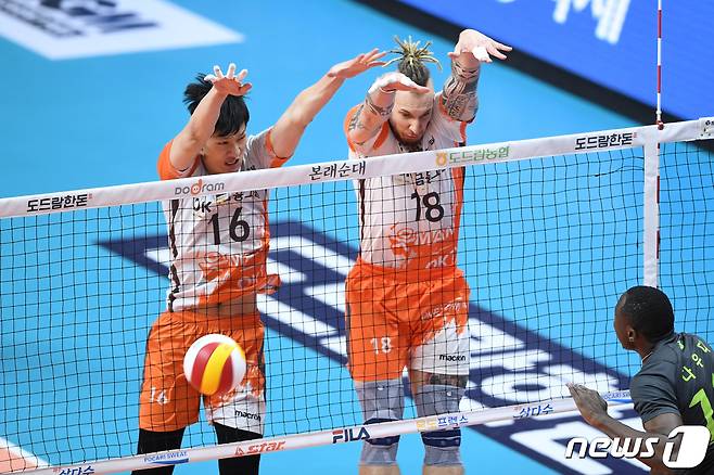 (서울=뉴스1) 김진환 기자 = 10일 오후 경기도 안산시 상록수체육관에서 열린 '도드람 2020-2021 V리그' 남자부 OK금융그룹과 현대캐피탈의 경기에서 OK금융그룹 진상헌과 펠리페(오른쪽)가 현대캐피탈 다우디의 스파이크 공격을 블로킹하고 있다. (KOVO 제공) 2021.1.10/뉴스1