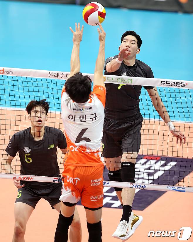 (서울=뉴스1) 김진환 기자 = 10일 오후 경기도 안산시 상록수체육관에서 열린 '도드람 2020-2021 V리그' 남자부 OK금융그룹과 현대캐피탈의 경기에서 현대캐피탈 허수봉이 OK금융그룹 블로커 앞에서 속공 공격을 하고 있다. (현대캐피탈 배구단 제공) 2021.1.10/뉴스1