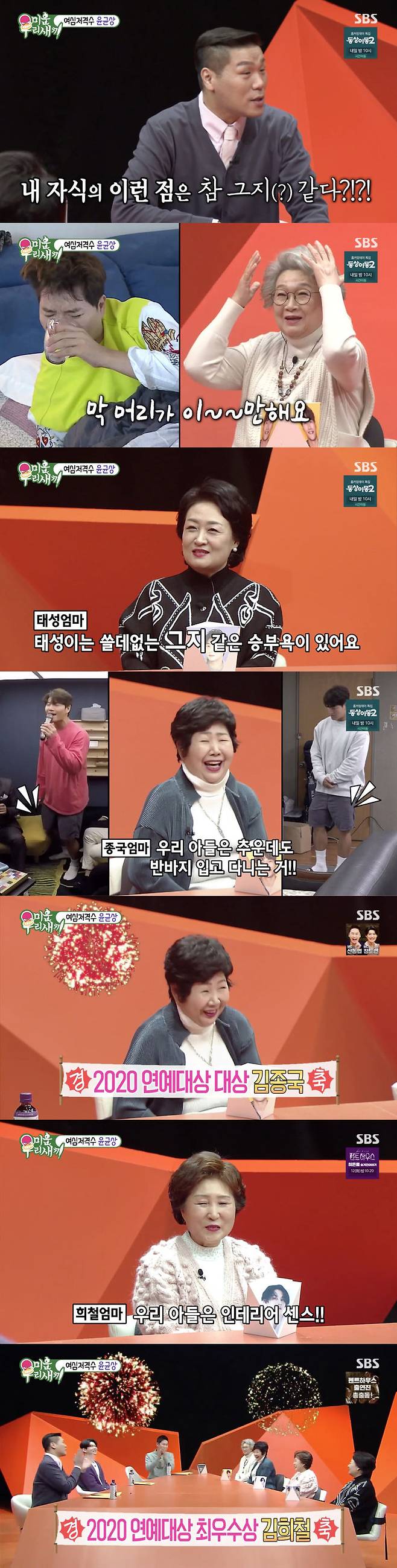 김종국 어머니는 "우리 아들은 추운데도 반바지 입고 다니는 거 그지 같다"라고 불만을 토로했다. 이에 서장훈은 "반바지를 입든 민소매를 입든 어떠냐. 김종국이 2020 SBS 연예대상을 대상 받았다"라며 어머니에게 축하를 했다. 그러자 어머니는 모든 분들 덕분이라며 감사 인사를 전했다.