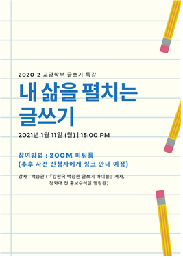 경희사이버대학교 교양학부가 오는 11일 온라인 실시간 시스템 Zoom을 통해 '내 삶을 펼치는 글쓰기'를 주제로 한 특강을 진행한다.