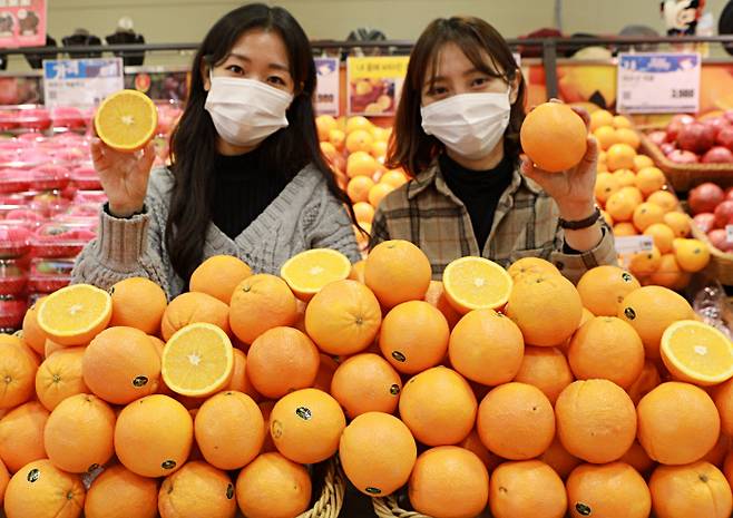 지난 9일 서울 중구 롯데마트 서울역점에서 모델들이 ‘캘리포니아산 오렌지’를 소개하고 있다. 캘리포니아산 오렌지는 매년 1~5월 국내에서 맛볼 수 있는 수입과일의 대표 품목이다.