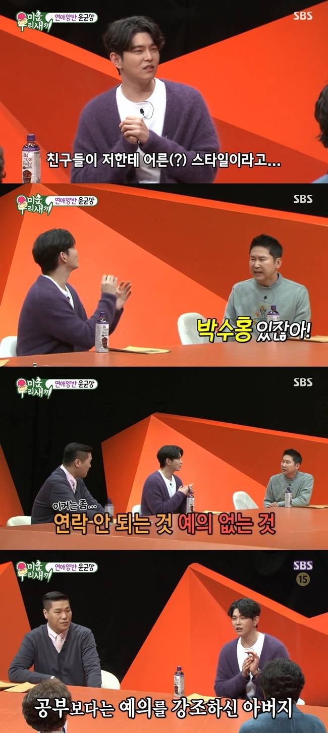 또한 윤균상은 "연락 안 되는 것, 예의 없는 것을 싫어한다"며 "어렸을 때 아버지가 공부하라는 말은 안 하셨다. 근데 동생이랑 싸우거나 생떼 부리거나 인사를 잘 안 하면 많이 혼났다"고 덧붙였다. (사진=SBS '미운 우리 새끼')
