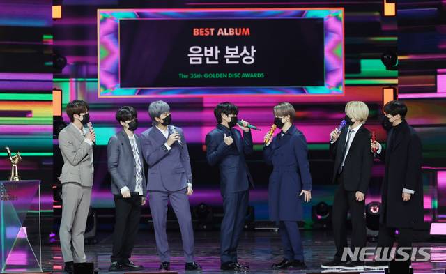 [서울=뉴시스]김병문 기자 = 방탄소년단이 10일 오후 경기도 고양시 대화동 킨텍스에서 언택트로 열린 ’제35회 2021 골든디스크 어워즈 with 큐라프록스’ 디지털 음반 부문에소 본상을 수상한 후 소감을 밝히고 있다. (사진=골든디스크어워즈 사무국 제공) 2021.01.10. photo@newsis.com