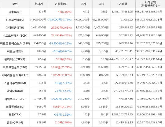 [표]가상화폐 시세 (제공: 암호화폐 거래소 업비트)