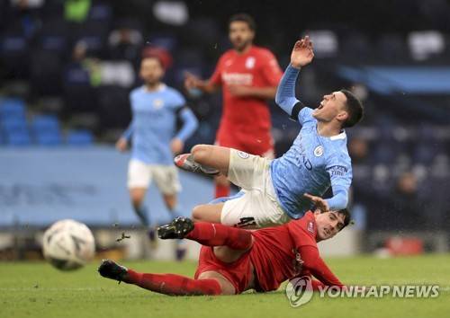 Birmingham City's Mikel San Jose, bottom, tackles Manchester City's Phil Foden during the English FA Cup third round soccer match at the Etihad Stadium in Manchester, England, Sunday Jan. 10, 2021. (Mike Egerton//PA via AP) UNITED KINGDOM OUT NO SALES NO ARCHIVE PHOTOGRAPH CANNOT BE STORED OR USED FOR MORE THAN 14 DAYS AFTER THE DAY OF TRANSMISSION