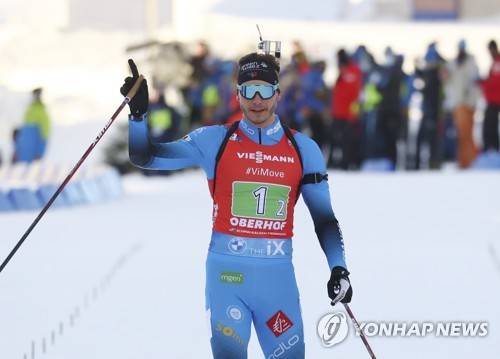 France's Emilien Jacquelin crosses the finish line to win with team mate Julia Simon the single mixed relay race at the Biathlon World Cup in Oberhof, Germany, Sunday, Jan. 10, 2021. (AP Photo/Matthias Schrader)