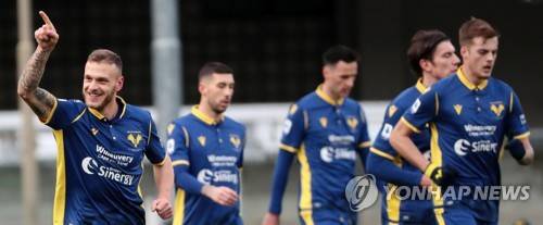 epa08930285 Hellas Verona's Federico Dimarco (L) jubilates after scoring the 2-0 lead during the Italian Serie A soccer match Hellas Verona vs F.C. Crotone at Marcantonio Bentegodi stadium in Verona, Italy, 10 January 2021. EPA/EMANUELE PENNACCHIO