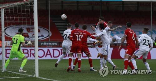 Leeds United's Liam Cooper, center, heads the ball during the English FA Cup third round soccer match between Crawley Town and Leeds United at Broadfield Stadium in Crawley, England, Sunday, Jan. 10, 2021. (AP Photo/Ian Walton)