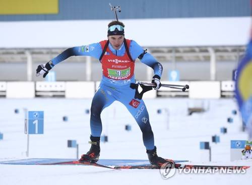 France's Emilien Jacquelin leaves the shooting range to win with team mate Julia Simon the single mixed relay race at the Biathlon World Cup in Oberhof, Germany, Sunday, Jan. 10, 2021. (AP Photo/Matthias Schrader)