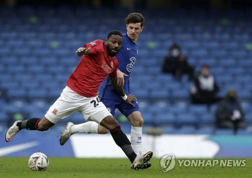 Morecambe's Yann Songo'o, left, duels for the ball with Chelsea's Mason Mount during the English FA Cup third round soccer match between Chelsea and Morecambe at Stamford Bridge Stadium in London, Sunday, Jan. 10, 2021. (AP Photo/Matt Dunham)