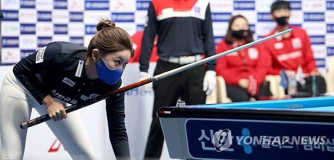 (서울=연합뉴스) 10일 경기도 고양 빛마루방송센터에서 열린 신한금융투자 PBA 팀리그 2020-2021 5라운드 웰컴저축은행과 신한금융투자의 경기에서 김가영이 공을 조준하고 있다. 2021.1.10 [PBA 제공. 재판매 및 DB 금지]