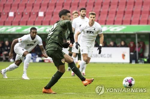 Stuttgart's Nicolas Gonzalez scores his side's opening goal during a German Bundesliga soccer match between FC Augsburg and VfB Stuttgart in Augsburg, Germany, Sunday, Jan.10, 2021. (Matthias Balk/dpa via AP) THE DEUTSCHE FUSSBALL LIGA DFL DOES NOT ALLOW THE IMAGES TO BE USED AS SEQUENCES TO EMULATE VIDEO.