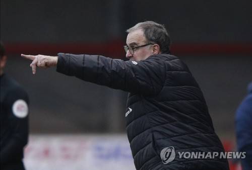 Leeds United's head coach Marcelo Bielsa gives instructions during the English FA Cup third round soccer match between Crawley Town and Leeds United at Broadfield Stadium in Crawley, England, Sunday, Jan. 10, 2021. (AP Photo/Ian Walton)