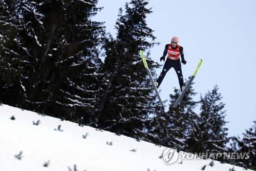 epa08930317 Severin Freund of Germany is airborne during the trial round of the Men's Single second competition at the FIS Ski Jumping World Cup in Titisee-Neustadt, Germany, 10 January 2021. EPA/RONALD WITTEK