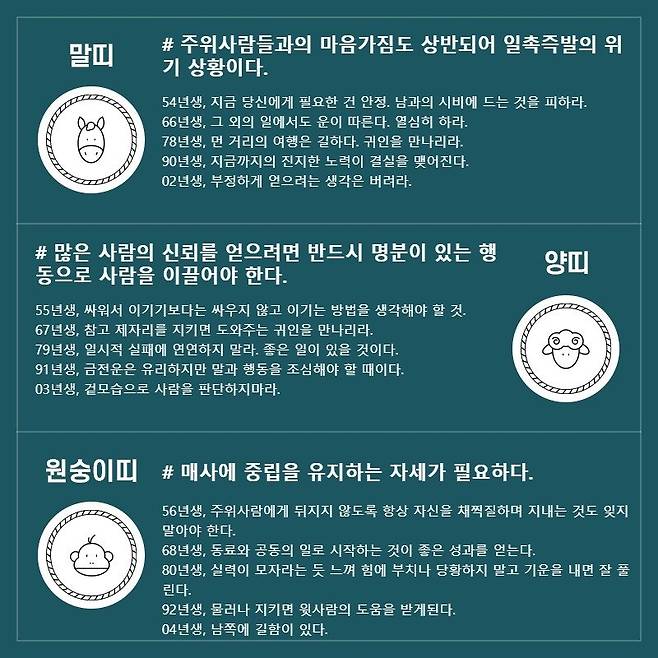 원숭이띠 # 매사에 중립을 유지하는 자세가 필요하다. 56년생, 주위사람에게 뒤지지 않도록 항상 자신을 채찍질하며 지내는 것도 잊지 말아야 한다. 68년생, 동료와 공동의 일로 시작하는 것이 좋은 성과를 얻는다. 80년생, 실력이 모자라는 듯 느껴 힘에 부치나 당황하지 말고 기운을 내면 잘 풀린다. 92년생, 물러나 지키면 윗사람의 도움을 받게된다. 04년생, 남쪽에 길함이 있다.