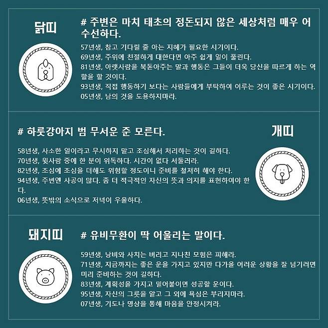 개띠 # 하룻강아지 범 무서운 준 모른다. 58년생, 사소한 일이라고 무시하지 말고 조심해서 처리하는 것이 길하다. 70년생, 윗사람 중에 한 분이 위독하다. 시간이 없다 서둘러라. 82년생, 조심에 조심을 더해도 위험할 정도이니 준비를 철저히 해야 한다. 94년생, 주변엔 사공이 많다. 좀 더 적극적인 자신의 뜻과 의지를 표현하여야 한다. 06년생, 뜻밖의 소식으로 저녁이 우울하다.