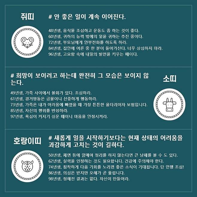 소띠 # 희망이 보이려고 하는데 완전히 그 모습은 보이지 않는다. 49년생, 가족 사이에서 불화가 있다. 조심하라. 61년생, 경거망동은 금물이니 신중하게 행동하라. 73년생, 가족은 내가 어려움에 빠졌을 때 가장 튼튼한 울타리이자 보험입니다. 85년생, 자신의 행위를 반성하라. 97년생, 욕심이 커지기 쉬운 때이니 마음을 안정시켜라.
