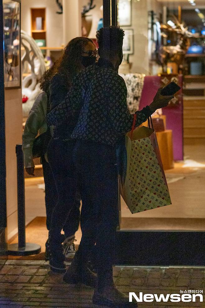 마스크를 써 눈만 보이지만 머라이어 캐리임을 알 수 있다. 쇼핑을 끝내고 나오는 모습을 포착한 사진에서는 지인이 든 커다란 쇼핑백이 눈에 들어온다.