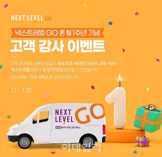 넥센타이어(002350)는 업계 최초의 비대면 타이어 방문 교체 서비스 '넥스트레벨 GO'의 론칭 1주년을 기념해 구매 고객 대상 감사 이벤트를 1월 한달간 실시한다고 11일 밝혔다.