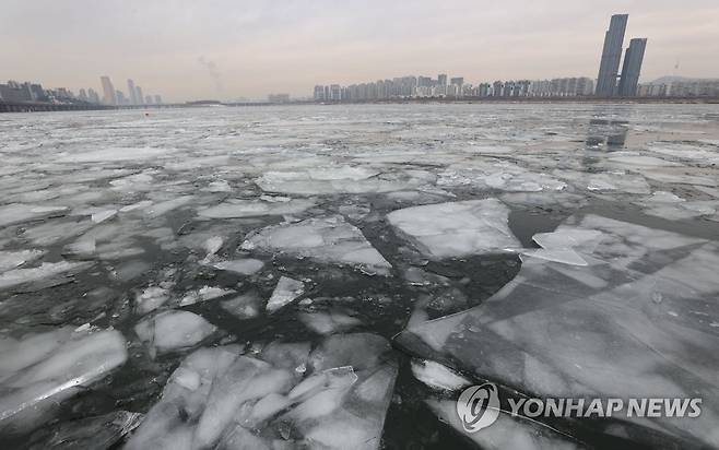 (서울=연합뉴스) 한종찬 기자 = '북극 한파'가 계속된 11일 오전 서울 동작대교 인근 한강이 얼어있다. 2021.1.11