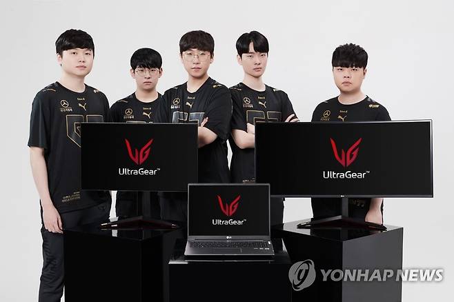 사진은 LG 울트라기어 게이밍 모니터, 게이밍 노트북앞에서 기념 촬영을 하는 젠지 '리그오브레전드' 팀. 2021.1.11