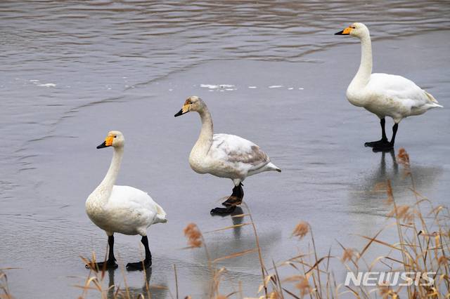 [남해=뉴시스] 차용현 기자 = 강추위가 기세를 부리고 있는 11일 오전 경남 남해군 설천면 인근에서 천연기념물 201-2호인 큰고니가 살얼음이 언 갈대밭 위를 걸어가고 있다. 2021.01.11. con@newsis.com