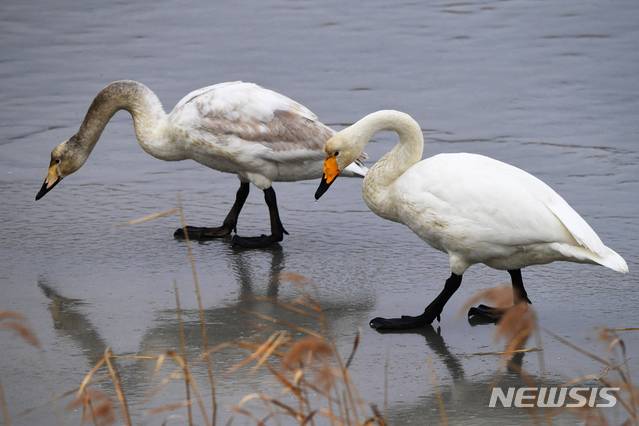 [남해=뉴시스] 차용현 기자 = 강추위가 기세를 부리고 있는 11일 오전 경남 남해군 설천면 인근에서 천연기념물 201-2호인 큰고니가 살얼음이 언 갈대밭 위를 걸어가고 있다. 2021.01.11. con@newsis.com