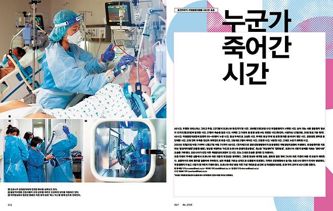 하루에 코로나19 신규 확진자가 1천 명씩 쏟아져나오기 시작한 2020년 12월 중순, 제1345호 표지이야기 ‘국립중앙의료원 48시간 르포’를 기획한 이유는 단순했습니다. 실은 <한겨레21>에 앞서 <한겨레>에서 5개월여 코로나19 취재를 맡았을 때부터 마음 한구석에 품고 있던 취재입니다. 그땐 매일 질병관리청과 보건복지부 정례브리핑을 챙기고, 감염병 전문가들에게 의견을 묻고, 각종 자료를 뒤지며 기사를 썼습니다.