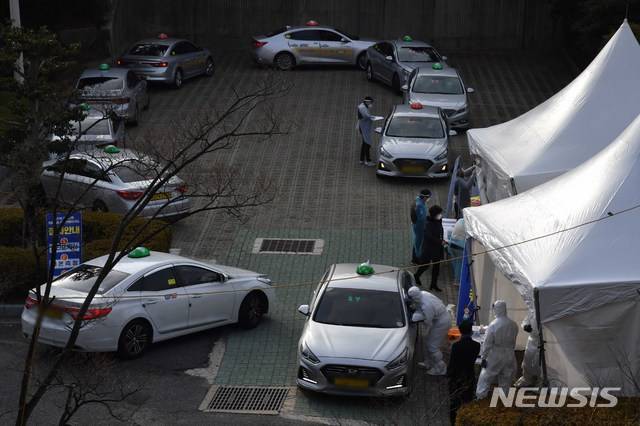 [부산=뉴시스] 하경민 기자 = 찾아가는 이동 선별검사소가 설치된 부산 연제구 부산아시아드주경기장 주차장을 찾은 택시 기사들이 11일 오전 드라이브스루 방식으로 코로나19 진단검사를 위한 검체를 채취하고 있다. 부산시는 무증상 감염 고리 차단을 위해 지역 택시 종사자 2만2000여명(개인택시 1만3837대, 법인택시 8600대)을 대상으로 한 찾아가는 이동 선별검사소를 오는 15일까지 닷새 동안 운영한다. 2021.01.11. yulnetphoto@newsis.com