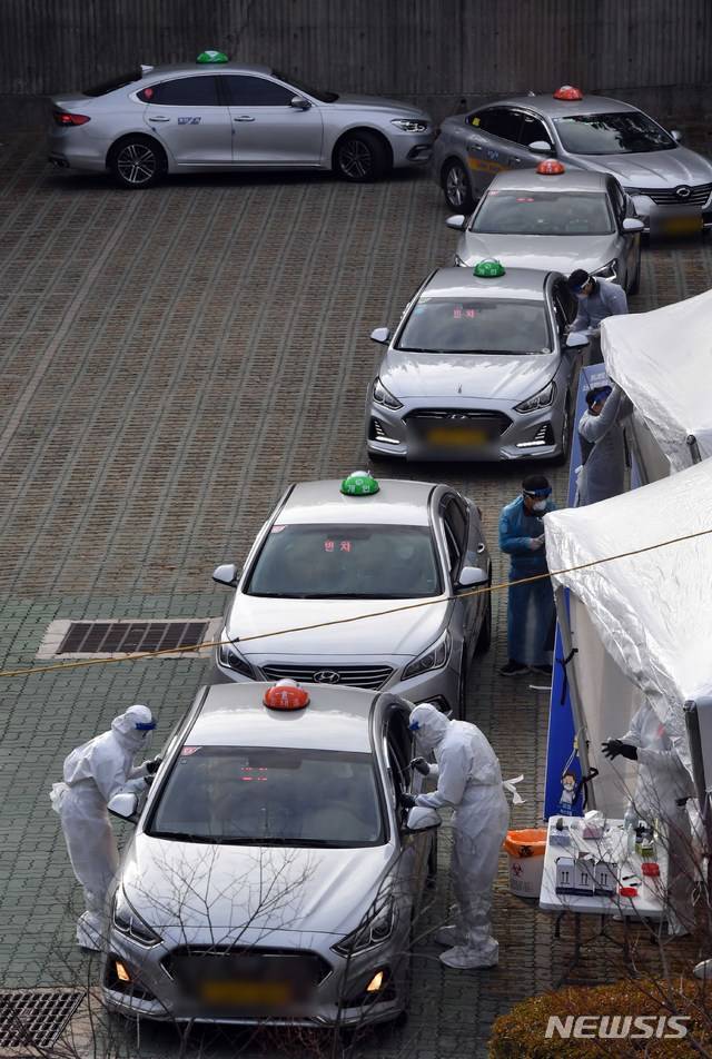 [부산=뉴시스] 하경민 기자 = 찾아가는 이동 선별검사소가 설치된 부산 연제구 부산아시아드주경기장 주차장을 찾은 택시 기사들이 11일 오전 드라이브스루 방식으로 코로나19 진단검사를 위한 검체를 채취하고 있다. 부산시는 무증상 감염 고리 차단을 위해 지역 택시 종사자 2만2000여명(개인택시 1만3837대, 법인택시 8600대)을 대상으로 한 찾아가는 이동 선별검사소를 오는 15일까지 닷새 동안 운영한다. 2021.01.11. yulnetphoto@newsis.com