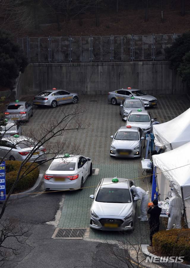 [부산=뉴시스] 하경민 기자 = 찾아가는 이동 선별검사소가 설치된 부산 연제구 부산아시아드주경기장 주차장을 찾은 택시 기사들이 11일 오전 드라이브스루 방식으로 코로나19 진단검사를 위한 검체를 채취하고 있다. 부산시는 무증상 감염 고리 차단을 위해 지역 택시 종사자 2만2000여명(개인택시 1만3837대, 법인택시 8600대)을 대상으로 한 찾아가는 이동 선별검사소를 오는 15일까지 닷새 동안 운영한다. 2021.01.11. yulnetphoto@newsis.com
