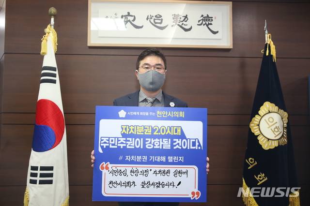 [천안=뉴시스]이종익 기자 = 충남 천안시의회 황천순 의장이 11일 오전 시의회에서 자치분권 2.0시대 개막을 응원하기 위한 '#자치분권 기대해' 챌린지에 동참하고 있다. (사진=천안시의회 제공) 2020.01.11. photo@newsis.com