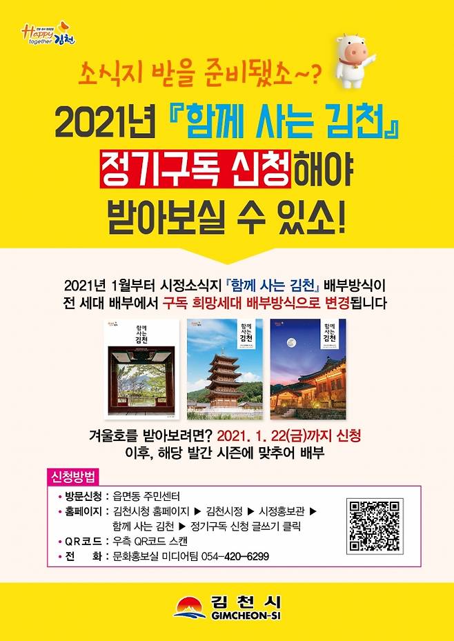 [김천=쿠키뉴스] 최재용 기자 = 경북 김천시는 많은 시민들이 쉽고 편리하게 시정소식을 접할 수 있도록 시정 소식지 ‘함께 사는 김천’을 세대일괄 배부에서 정기구독 희망자 배부 방식으로 전환한다고 11일 밝혔다.