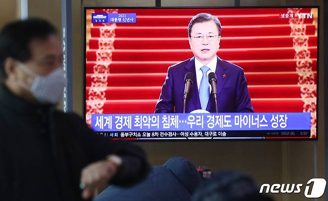 (서울=뉴스1) 민경석 기자 = 11일 오전 서울 중구 서울역 대합실에서 시민들이 문재인 대통령의 신축년(辛丑年) 새해 신년사 발표 생중계를 TV를 통해 지켜보고 있다.