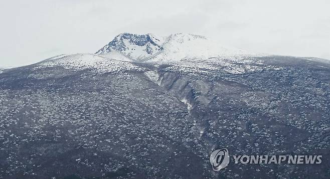 (서귀포=연합뉴스) 박지호 기자 = 제주도 산지에 대설주의보가 내려진 11일 오전 눈 쌓인 한라산 정상부가 잠시 모습을 드러내고 있다. 2021.1.11