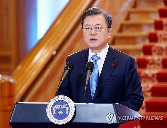 (서울=연합뉴스) 최재구 기자 = 문재인 대통령이 11일 청와대에서 신년사를 하고 있다. 2021.1.11