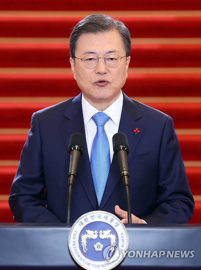 (서울=연합뉴스) 최재구 기자 = 문재인 대통령이 11일 청와대에서 신년사를 하고 있다. 2021.1.11