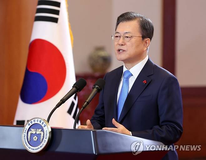 (서울=연합뉴스) 최재구 기자 = 문재인 대통령이 11일 청와대에서 신년사를 하고 있다. 2021.1.11